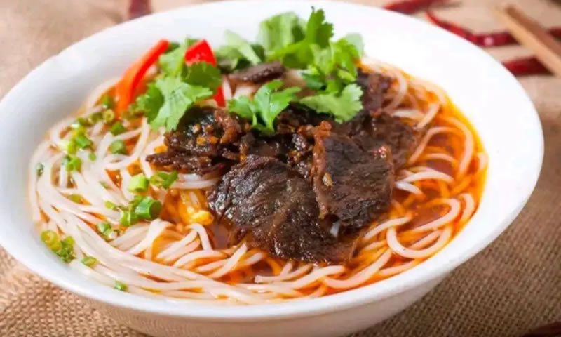 (3)粉烫好后放进碗中,加入适量小葱(切碎的)、香菜(切成2~3公分长)、酸泡菜(切成小片。约V-2公分宽的》、一勺专用油(约普通酒瓶盖2盖,、如果油是结冻的,事先要先加热融化),然后加入一大勺80℃左右的米粉汤(要求汤要浇在加油的位置,汤要够多,要明显盖过碗里的米粉),最后再加入适量牛肉或牛肚、牛肝等以及少量精品花椒粉即成。